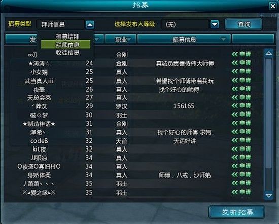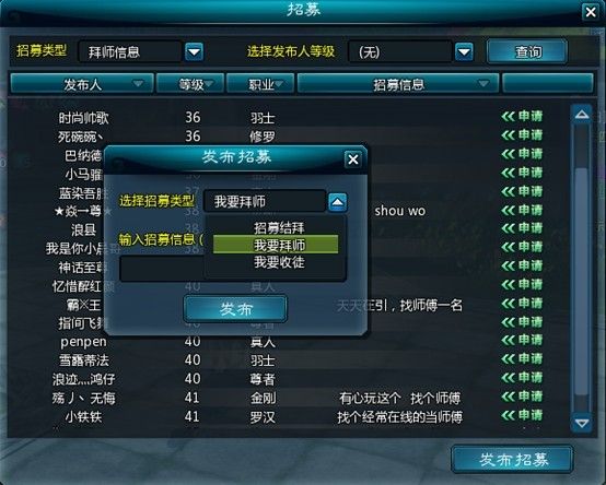 3、选择“我要拜师”或者“我要收徒”输入相关招募信息即可。你也可以选择右上角的“查询”按钮,直接查询已有招募信息,进行拜师、收徒相关操作。
