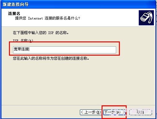 7、在文本框中输入”宽带连接“,单击”下一步“,如图: