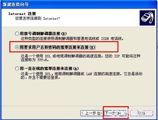6、勾选”用要求用户名和密码的宽带连接来连接“,单击”下一步“,如图: