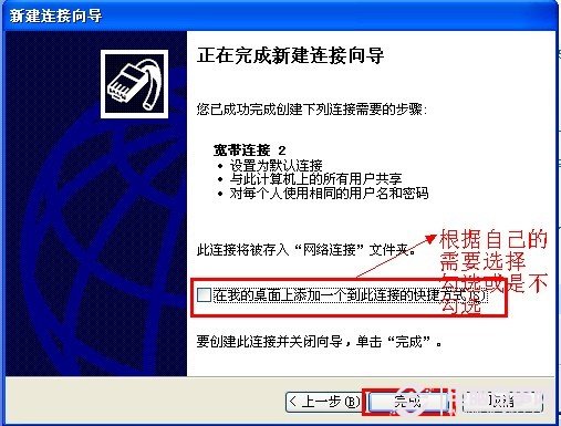 9、根据自己的需要,选择是否勾选”在我的桌面上添加一个到此连接的快捷方式“,然后单击”完成“,如图: