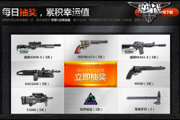 《逆战》开放测试的时间日益临近,各种游戏活动也纷至沓来。QQ网吧玩家将首先开启缤纷活动,获得抽奖资格,赢取丰厚大奖。在QQ网吧上网的玩家,每天可以参与一次官方网站的抽奖活动,在抽奖的同时,收听并转发微博,将有机会获得包括银牌AWM-S银牌M4A1-S、KACSAW、军用手斧等在内的热门武器,与此同时,每次抽奖玩家还可额外获得1点幸运值,用以兑换更多更为丰厚的道具。