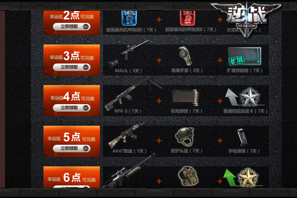 在积累到一定幸运值后,玩家可凭借幸运值,兑换自己喜爱的道具。超级暴风机甲执照、高爆手雷、巴雷特M95、防弹头盔、防弹衣等多重好礼玩家都可以免费兑换。