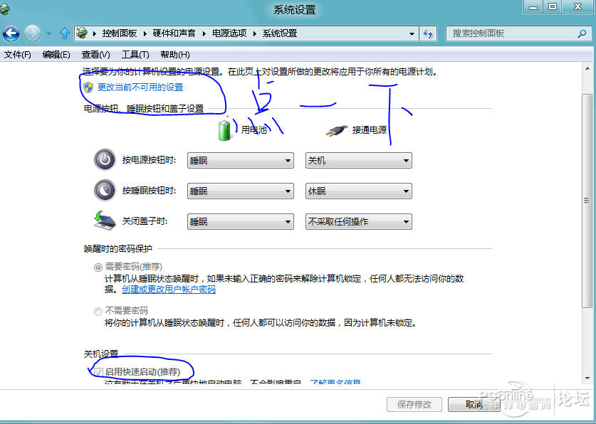 进入电源选项,点击“唤醒时需要密码”或如图: