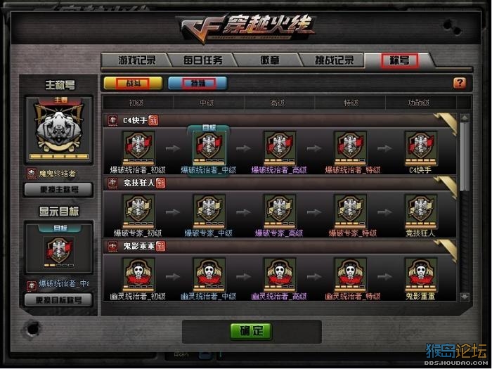 每个称号分为“初级”“中级”“高级”“特级”“功勋级”五个等级,玩家是通过完成称规定的游戏任务,逐级解锁一个系列的称号,获得更高级的属性加成。