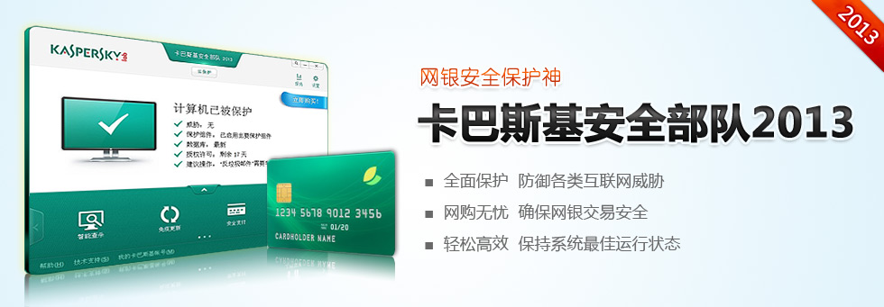相信有了卡巴斯基安全部队2013的专业保护,大家可以安全地使用在线银行,进行网络购物,而无需担心安全问题啦!