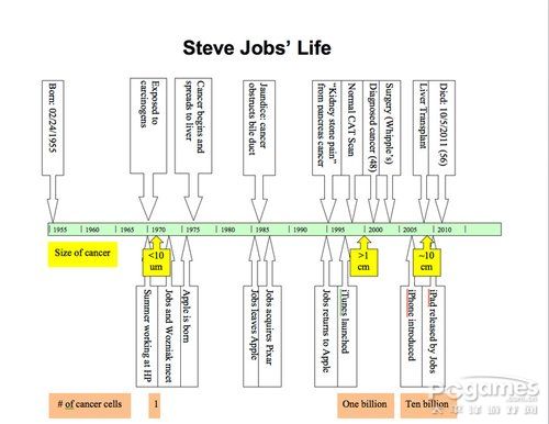 得到这个增大周期之后,乔布斯癌症开始的时间就可以计算。他的癌症始于年轻时代,可能是24岁。类似的计算可知,在2004年7月31日做手术之前20多年,他的癌症就已经从胰腺发展到肝脏(和身体其他部位)。