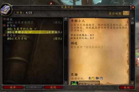 去年的拯救梅森任务已经变为该任务。同样开始于城里的烟林牧场的地精NPC,要求你击杀希尔斯布莱德的讨厌的格林奇,这个家伙在4.3版本是拥有334万血量的BOSS,而5.0版本暂时未知,需要组队击杀。完成任务后可获得“被窃的礼物”,可开出紫色装绑匕首、绝版宠物、玩具等。