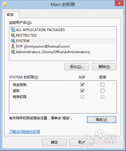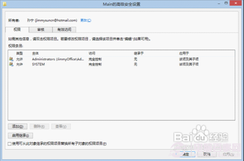在高级安全设置窗口中,点击“启用继承”按钮,在点击“应用”、“确定”按钮保存设置并关闭高级安全设置窗口。
