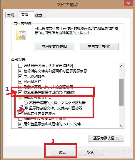 三、如上图,点击“选项”后我们即可看到我们熟悉的“文件夹选项”设置对话框了,这时只需要将“隐藏受保护的系统文件(推荐)去”前面的勾去掉,然后再将选中“显示隐藏的文件、文件夹和驱动器”即可,最后点击底部的“确定”完成设置即可,如下图: