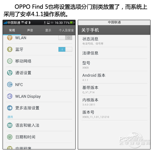 OPPO Find 5搭载了基于安卓4.1.1深度定制的操作系统,从设置选项可以看出OPPO还是下了很多功夫在系统定制优化上的。