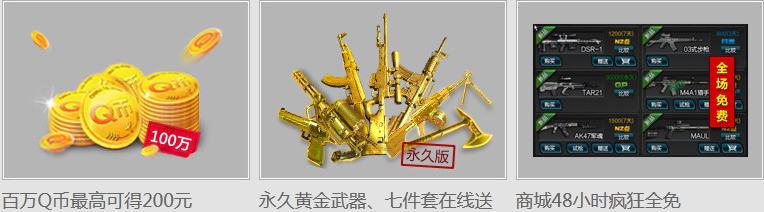 百万Q币最高可得200元,永久逆战黄金武器,7件套在线送,商城48小时疯狂全免。