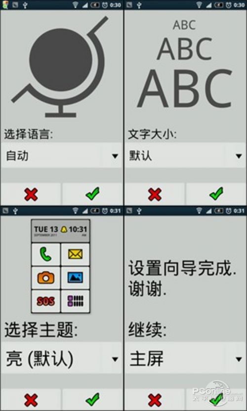 小编要为大家介绍的软件名为Big Launcher,就是英文“大手机”的缩写。当用户装好软件后,会首先启动一个向导,帮助我们完成语言设定、文字大小、主题颜色等设置,接下来就是传说中的老人机界面了。