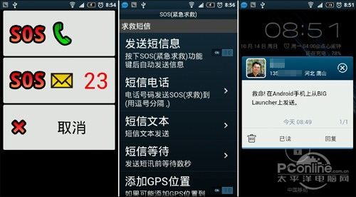 而且Big Launcher的设计非常人性化,不但支持同时关联多部手机(比如同时关联丈夫和妻子),还特别加入了一项拨号/短信延迟功能(默认30秒,可自改),当老人发现自己是误点后,只要按下“取消”键即可中止信息发送。如果你的手机支持GPS,还会有一个特别福利发出,即自动在短信后附加GPS的详细定位,以帮助亲友快速定位老人位置。