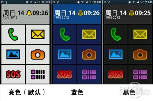 Big Launcher内置三组主题,分别是“亮色”、“黑色”和“蓝色”,小编觉得这项功能的真实意义也许并不是美观,因为完全是为了满足个别老人的特殊需要(比如白内障或者近视、色弱)。