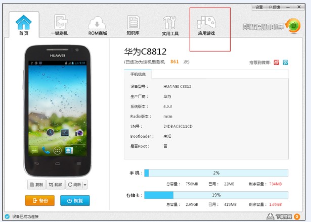 三、驱动安装完成了,连接上的手机后,先要备份好手机的信息和联系人,再检查手机是否ROOT了,只有ROOT后才可以刷机,如果没有ROOT,可以打开实用工具,点击临时ROOT或者永久ROOT,遇到ROOT失败,可以试试多次就有可能成功了。