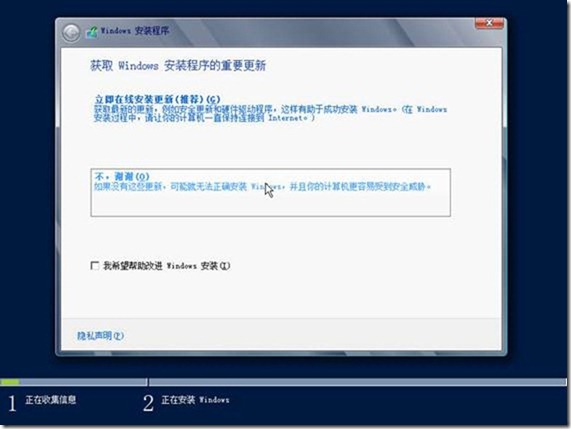 (4)在“获取Windows安装程序的重要更新”对话框,选择“不,谢谢”,如下图所示。因为我的网络中有WSUS,平常都是使用WSUS更新的。