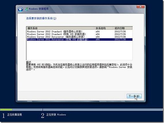 (5)在“选择要安装的操作系统”,选择要安装的操作系统,在此选择“Windows Server 2012 Datacenter(带有GUI的服务器)”,如下图所示: