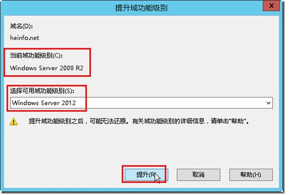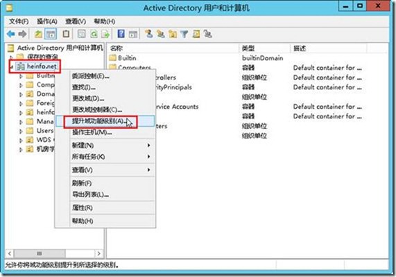 等域控制器升级到Windows Server 2012后,可以将网络中的服务器升级到Windows Server 2012,最后在“Active Directory用户和计算机”中,将域功能级别提升到“Windows Server 2012”即可,如下图所示:
