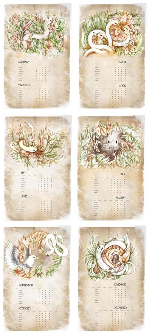 这一款2013日历出自bmsolari,其设计理念相当中国化,将我国2013年的生肖——蛇作为设计主题,这在我国的日历设计中还是比较常见的。据设计师介绍,从1月到12月,总共展现了蛇的重生过程。不过,显然这款2013年日历还融入了一些西方的设计元素,整体设计显得别树一帜。