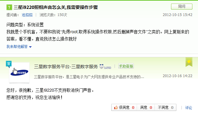 首先要跟大家声明的是三星I9220不支持取消快门声音,下面是网友在网上询问怎么关闭快门声音,三星方面给出的回复。
