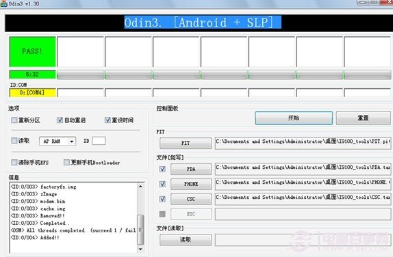 5、点击star选中之后,然后在刷机工具最上方的第一个方框显示PASS或者重启等,具体版本不一,手机重启,说明已经刷入recovery成功了。