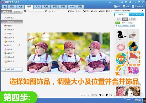 3、进入“饰品”菜单下点击“潮流涂鸦”分类,选择一些素材进行装饰,调整大小及位置并合并饰品素材。