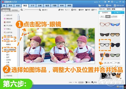 6、然后点击“配饰-眼镜”分类,选择一个黑框眼镜,哇,好有范儿啊!适当调整大小及位置后合并该饰品素材。