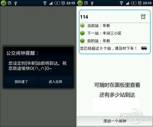 有了列表就可以设定下车站点了,软件一般会在目标站的前一站关门后提醒,大家可以利用这个空当挤到车门那里去哦!另外,要提醒大家的是公交闹钟的默认提醒方式为振动,因为目前也只有振动一种,没有铃音哈,所以说其实在公交车上还是蛮实用的。