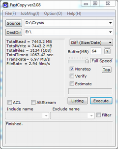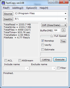 FastCopy:FastCopy是Windows 平台上最快的文件拷贝、删除软件。由于其功能强劲,性能优越,一时间便超越相同类型的所有其他软件。由于该软件十分小巧,你甚至可以在安装后,直接将安装目录中的文件复制到任何可移动
