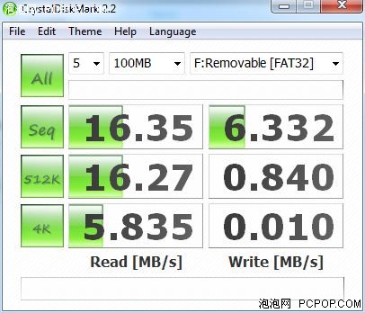 CrySTalDiskMark测试下,卡巴斯基杀毒U盘的测试成绩读取速度为16.35MB/s,写入速度为6.33MB/s。