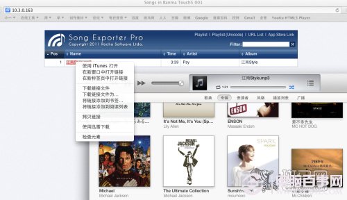 相比需要切换浏览器内核的Windows平台,在自家的MAC OS平台上打开这个网址后的操作就要简便的多。直接点击会启动下载工具进行下载,在快捷菜单中用使用iTunes打开,可以直接进行播放。