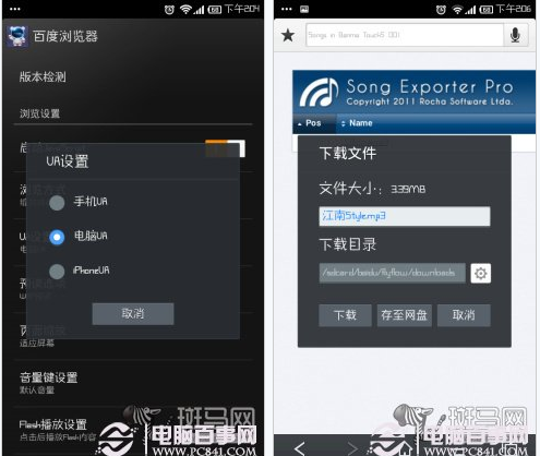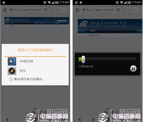 只要在浏览器的设置中,将这个标识更改为PC版(桌面版)后,再次载入这个网址,就可以进入音乐共享页面了。点击音乐名称,系统浏览器将会调用系统音乐播放器进行播放,但同样是由于兼容性问题,有的时候会显示一首mp3格式的音乐是“无法播放的音乐格式”,有的时候又能直接进行播放。