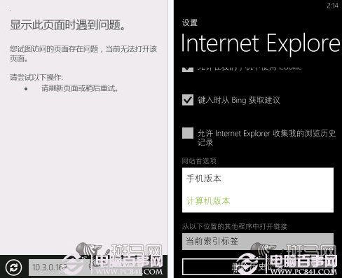 WP设备的内置浏览器依然是IE内核,不过由于是手机UA所以会导致页面无法打开。所以进入设置中将“网站首选项”改为“计算机版本”才能打开网页。如下图IE浏览器需要更改UA: