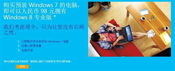 微软为Windows用户提供了升级至Windows 8专业版的优惠。如果你在2012年6月2日至2013年1月31日期间购买带有有效Windows 7 OEM真品证书和产品密钥的新电脑,那么还可以再额外享受Windows Upgrade Offer升级优惠,只需98元就可升级至Windows 8专业版。