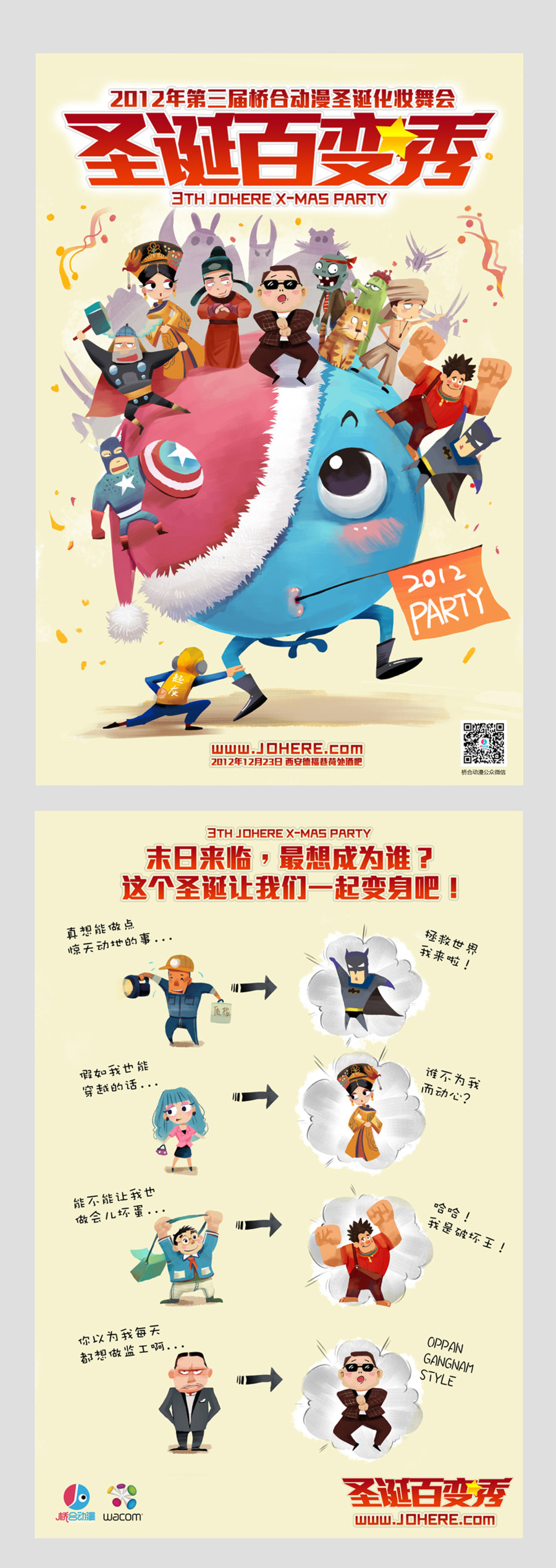 创意方案:这次海报设计的主题是圣诞化妆舞会,要表现的是诙谐轻松的画面效果,所以选用的形象也都是近来大家非常熟悉的鸟叔、少年派、蝙蝠侠、无敌破坏王、甄嬛、元芳等这些2012年的热带你人物,将这些人物的集合体现了岁末大狂欢的活动主题。紧接着就会出现下一页的漫画说明,将现实人物和动漫角色以及偶像人物的互换,体现了变装舞会的特点,好玩更有趣,激发了人们的参与感哦!