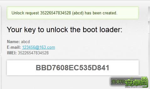 7.此时网站会自动生成解锁码(KEY),请记录好,如图所示(图中信息为随机输入):