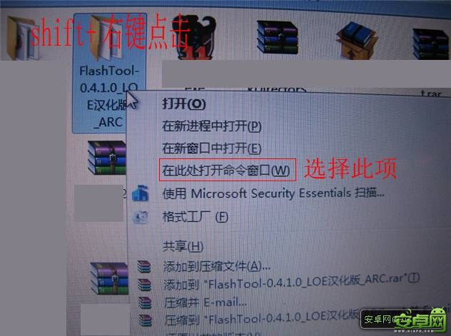 8.下载FlashTool工具,解压至任意位置,如D:/FlashTool,然后按住“shift"键之后,在文件夹上点击“右键”,选择“在此处打开命令窗口”,如图: