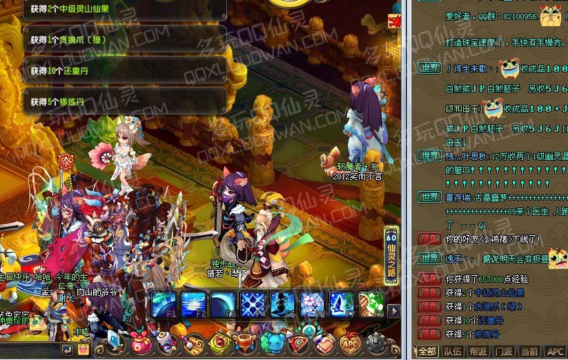 我是69级所以经验:657000经验,2个中级灵山仙果,1个绿宠装,10个还童,5个修炼丹(20经验)