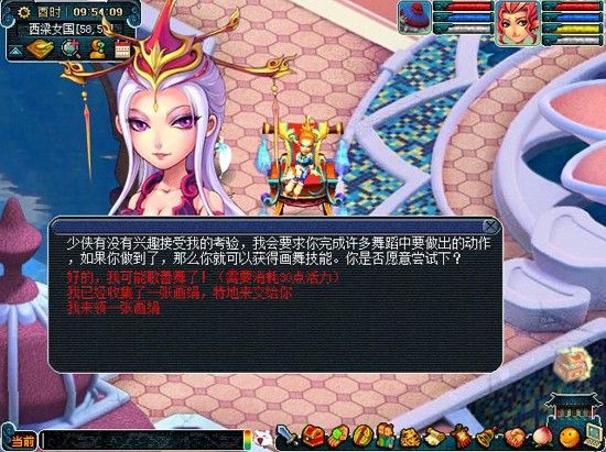 三界少侠可以在宝象国(107,33),西梁女国(53,59),朱紫国(152,42),傲来国(202,69)找到舞蹈名家。每天的12:30-13:00和19:30-20:00,舞蹈名家都会给三界少侠一个小考验,只要完成他们的考验,就能获得奖励。