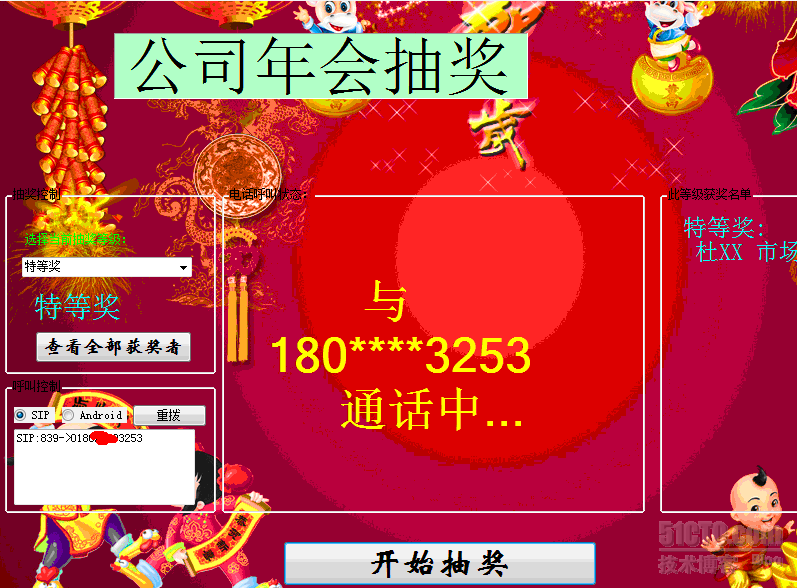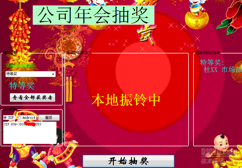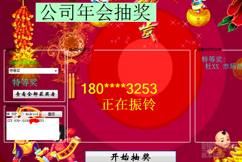 抽奖程序,抽中后可以自动呼叫对方号码。导入号码前请检查员工登记的手机号码,如果是外地手机,需要在EXCEL的“电话”字段的号码前面加0。