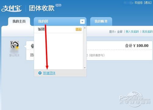 在支付宝团队收款主页上点击“我的团”,点击“新建团队”。