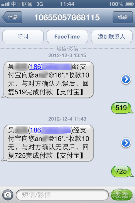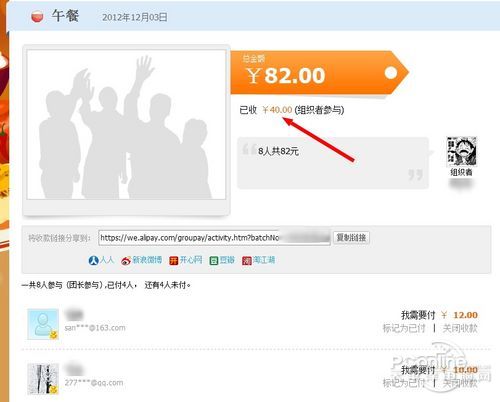 创建活动成功之后,团友中除了自己之外都会收到一条收款通知短信,如果用户的支付宝有余额的话,直接回复数字就可以进行付款(一条短信费用在免费到2毛钱之间,由你的手机话费套餐决定)。