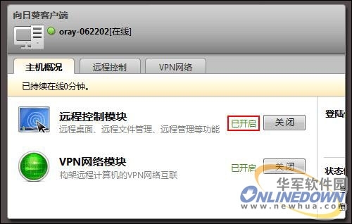 登录向日葵的被控端后,用户可以查看主机概况,远程控制情况以及VPN网络的成员信息。