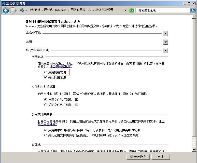 5.2.要建立 “网络负载平衡群集” ,需要先在 “高级共享设置” 中打开 “启用网络发现” 功能。