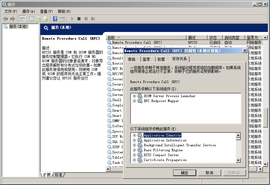 5.4.在“网络负载平衡管理器”中建立群集,群集连接主机时显示“RPC连接服务器不可用”等错误信息,可尝试检查主机有否打开“Remote Procedure Call(RPC)”和“Remote Procedure Call(RPC)Locator” 服务,并查检“Remote Procedure Call(RPC)的属性——依存关系——依赖服务” 的“状态”是否已经全部设置为 “已经启动” 或 “启动类型” 设置为 “自动”。