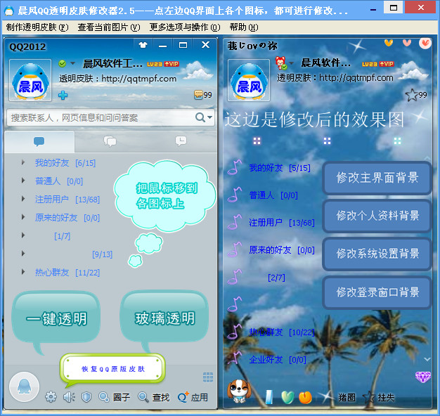 想使你的QQ皮肤个性化十足吗?那就赶紧去试试QQ透明皮肤修改器吧,只需一键,你就可以拥有个性十足的透明皮肤哦!