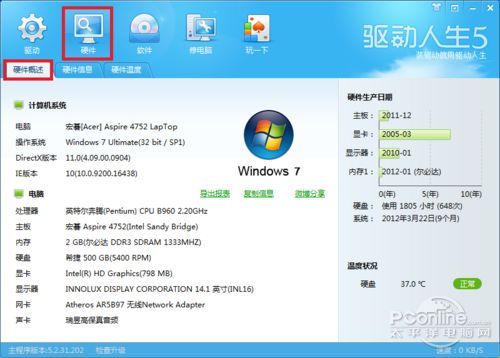 在驱动人生5的硬件界面,通过硬件概述栏,我们可以清楚的看到电脑各硬件配置的基本情况。通过驱动人生5检测的硬件型号,还有出厂日期,我们可以参考判断准备入手的新机配置是否有被奸商偷梁换柱。