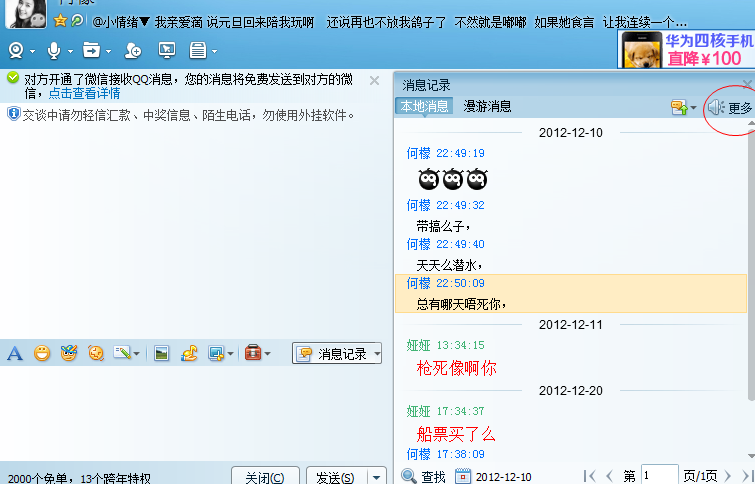 首先,大家点开那个要删除的QQ好友的对话框,点击消息记录,然后选择右上角的“更多”。如下图所示: