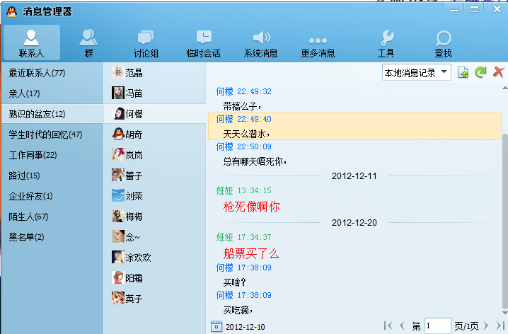 然后,进入消息管理器的页面,随便将鼠标放在一条信息上面,右击鼠标会出现“删除选中记录”和“删除所有记录”,大家只需选择删除所有记录,就可将与此QQ好友的聊天记录全部删除啦!