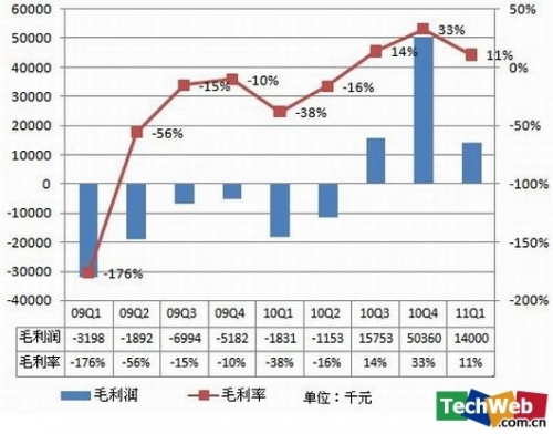 优酷网第一季度毛利润达到人民币1400万元(210万美元),2010年同期毛亏损为人民币1830万元(280万美元)。